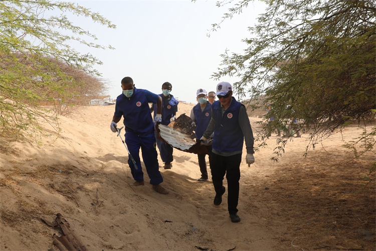 中吉双方人员协力清理海滩。中国人民解放军驻吉布提保障基地供图