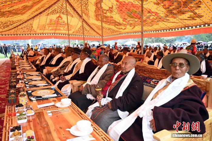 7月20日,第四届卓尼县风情旅游艺术节暨百名长寿老人共品“三宴”活动在甘肃省甘南藏族自治州卓尼县刀告乡当尕滩开幕。图为近百名百岁老人共品藏王盛宴,共庆寿辰。九美旦增 摄