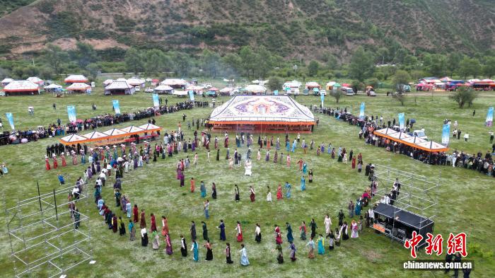 图为藏族民众在草地上跳起锅庄舞共庆佳节。(无人机照片) 九美旦增 摄