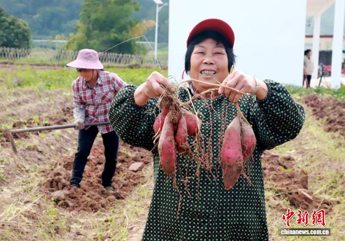 图为村民正在采收红薯。李金 摄