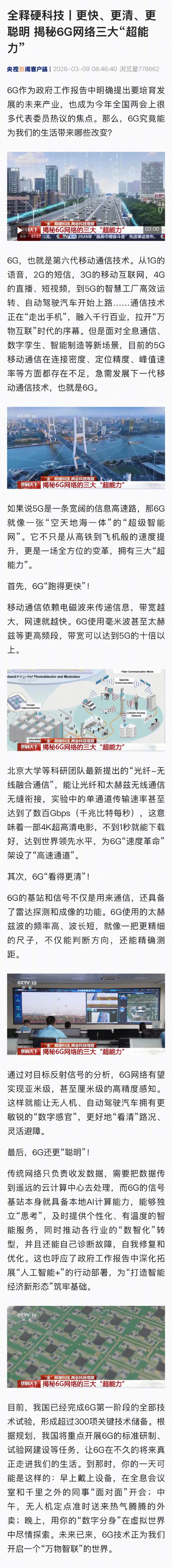 从1G的语音,2G的短信,3G的移动互联网,4G的直播、短视频,到5G的智慧工厂高效运转、自动驾驶汽车开始上路……通信技术正在“走出手机”,融入千行百业,拉开“万物互联”时代的序幕。但是面对全息通信、数字孪生、智能制造等新场景,目前的5G移动通信在连接密度、定位精度、峰值速率等方面都存在不足,急需发展下一代移动通信技术,也就是6G。如果说5G是一条宽阔的信息高速路,那6G就像一张“空天地海一体”的“超级智能网”。它不只是从高铁到飞机般的速度提升,更是一场全方位的变革,拥有三大“超能力”。