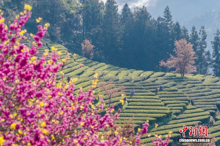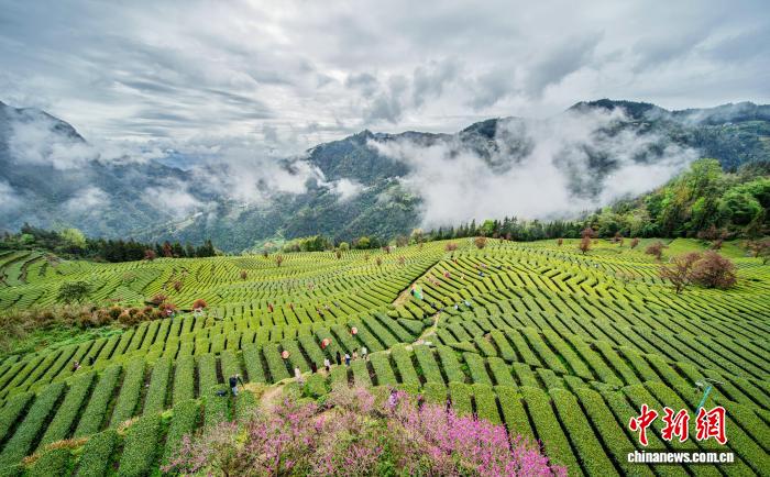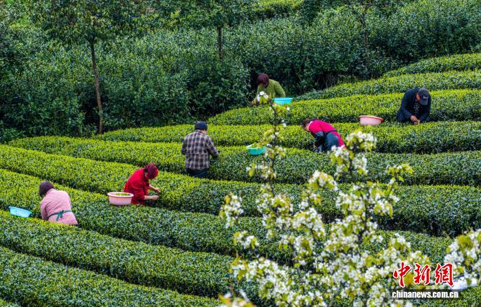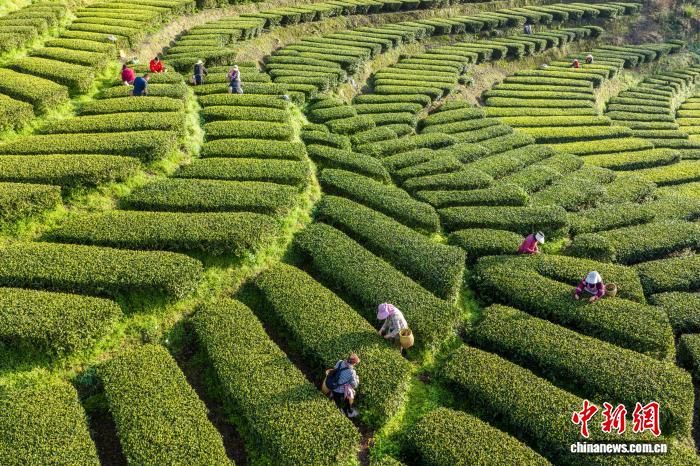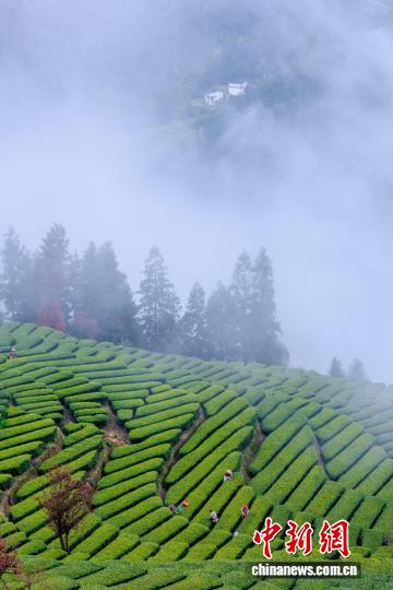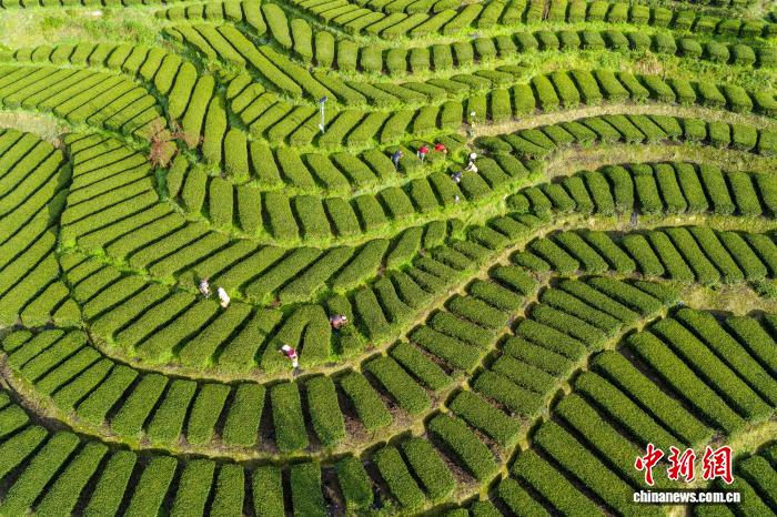 图为茶农在“画”中采春茶。王关政 摄