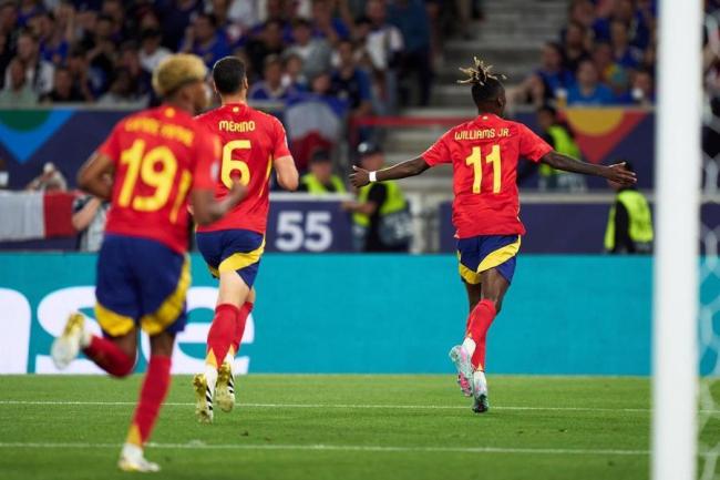比赛开始不久,特奥禁区外起脚突施冷箭,皮球稍稍高出横梁,西班牙队逃过一劫。第12分钟,登贝莱右路突破倒三角回敲,拉比奥特巧妙将球漏过,特奥跟上劲射击中横梁弹出。第20分钟,奥利塞策动反击,拉比奥特带球推进,禁区前沿起脚劲射打高。连续浪费机会后,法国队很快遭到惩罚。第22分钟,亚马尔右路做球,奥亚萨瓦尔背身回敲,尼科-威廉斯晃开角度起脚爆射破门,西班牙队打破僵局,1-0。三分钟后,奥亚萨瓦尔回撤送出挑传,梅里诺插上形成单刀,冷静推射命中,西班牙队迅速扩大优势至2-0。