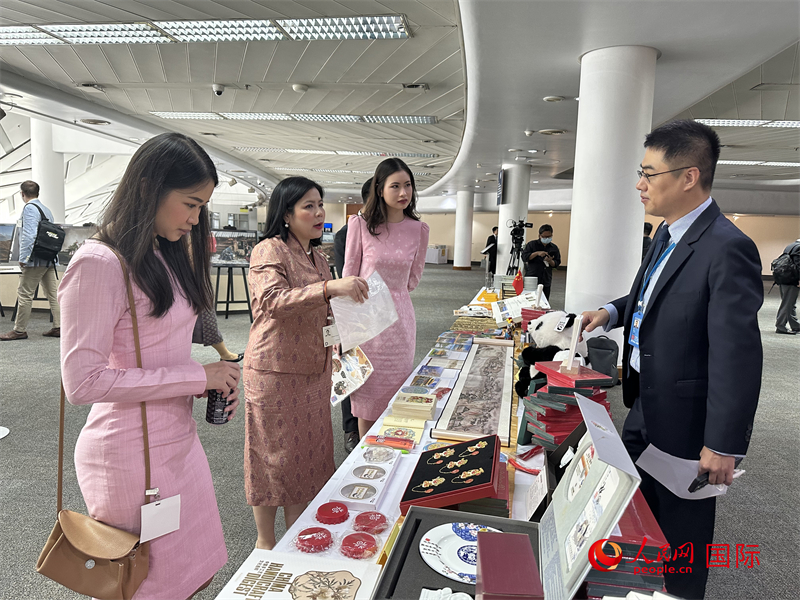 与会代表在中国展台前欣赏传统手工艺品感受中华文化。人民网记者 孙广勇摄
