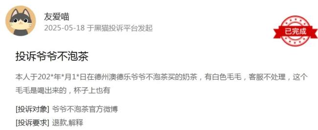事件迅速引发连锁反应。黑猫投诉平台数据显示,近30天内针对爷爷不泡茶的投诉量激增,涉及“缺斤少两”“小料变质”“饮品馊坏”等问题。例如,5月18日有消费者投诉在德州门店购买的奶茶中喝出“白色毛毛”;5月11日另一消费者称收到5月9日制作的“胀气饮品”,并出现腹泻症状。