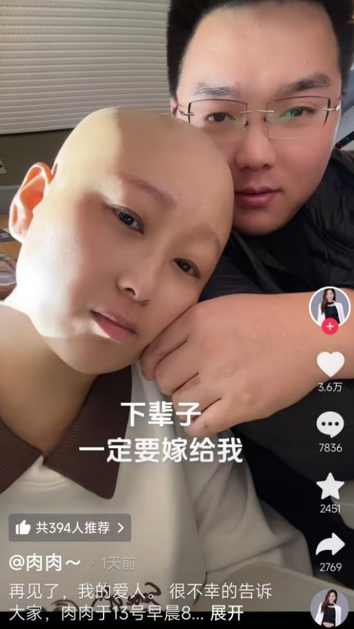 “肉肉”是陕西延安人,年仅35岁。2023年7月被确诊为乳腺癌后,她在社交账号上记录了自己的抗癌经历。从确诊到离世,仅仅过去了一年十一个月。她曾有一段婚姻,并和前夫生了一个男孩。治疗期间,男友一直陪伴在她身边。“肉肉”的账号粉丝数达到了23.3万,她的新年愿望是“没有疼痛,吃得下饭,睡得了觉,看得见路”。她曾在视频中提到,化疗后大量脱发,病情恶化严重,甚至双眼失明。