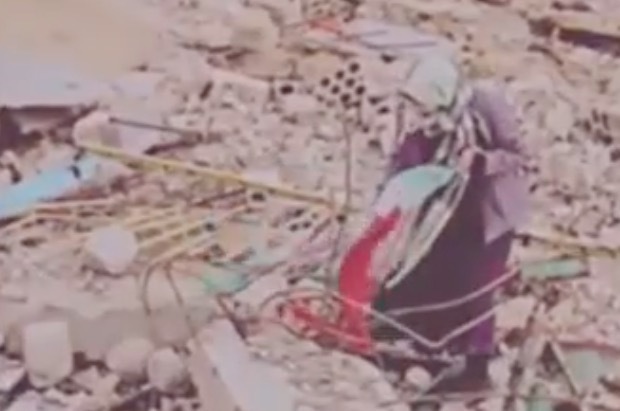 6月22日晚,伊朗驻华大使馆发布一段视频,一女子在废墟中找到一面伊朗国旗。在空袭警报中,她将旗帜高高扬起。伊朗驻华大使馆称:“我们伊朗永不屈服”,“我们永不低头”。