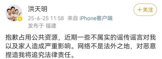 6月25日,洪金宝的长子洪天明发布律师声明,否认了有关他出轨的传闻。他表示,近期一些不实的谣言对他及家人造成了严重影响,并强调网络并非法外之地,将对恶意捏造者追究法律责任。