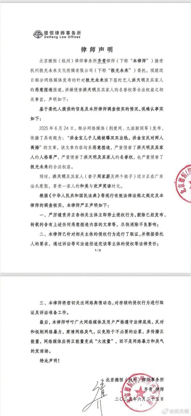 律师声明中提到,6月24日部分网络媒体发布了题为《洪金宝儿子儿媳被曝双双出轨,洪金宝反对两人离婚》的文章,该文章内容均为恶意捏造,严重侵犯了洪天明及其家人的人格尊严和名誉权。