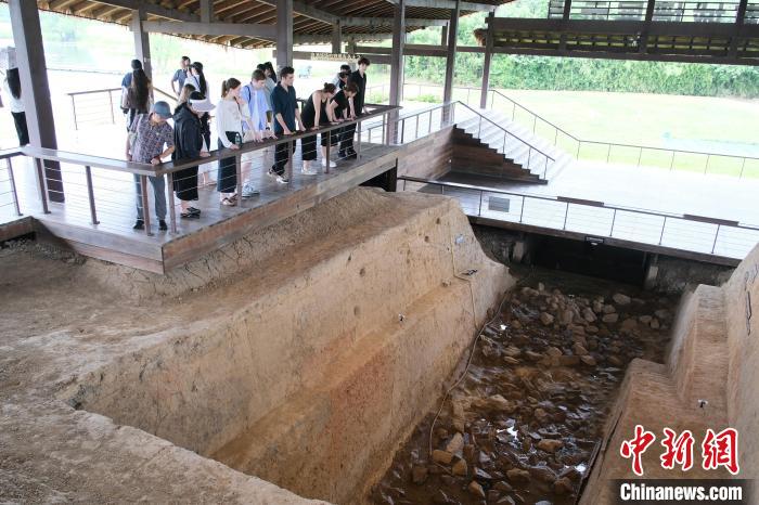 2025年6月,中外游客在良渚古城遗址公园内了解遗址细节。曹丹 摄