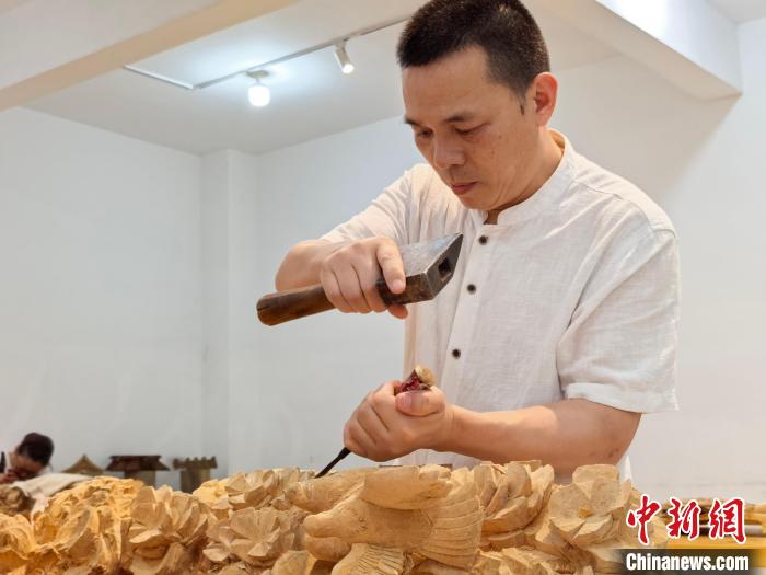 中新网金华7月10日电(张煜欢)走进位于浙江金华东阳木雕小镇的胡先民工作室,在刻刀与木料摩擦的沙沙声里,全国自强模范、浙江省工艺美术大师胡先民俯身于听障学徒张真飞旁,帮其细致调整切削力道。一刻一凿间,木屑簌簌飘落,一片片祥云打磨而出,师徒俩沉浸于手中的方寸天地。