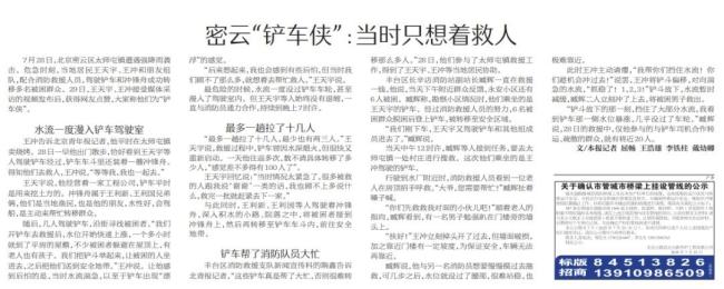几人驾驶铲车沿街寻找被困者。水位快速上涨,一个多小时就到了平房的屋檐,不少被困者躲避在屋顶上,有老人也有孩子。他们把铲斗举起来,让被困的人坐进去,之后把他们送到安全地带。水流湍急,铲车一度出现“漂浮”的感觉。尽管如此,王天宇等人始终没有退缩,与消防员通力合作,一直持续到19时许。