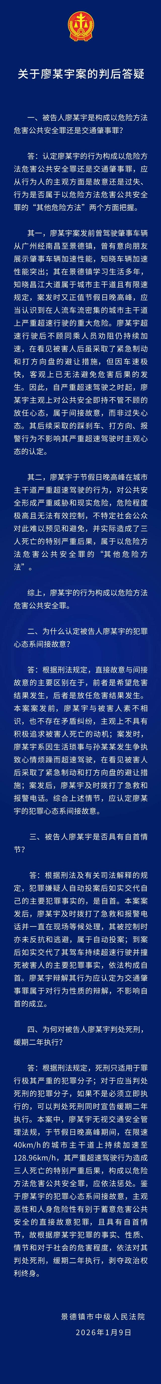 法院回应为何对廖某宇判死缓 景德镇中院判后答疑!2026年1月9日,江西省景德镇市中级人民法院对被告人廖某宇以危险方法危害公共安全案进行了一审公开宣判。法院判处廖某宇死刑,缓期二年执行,并剥夺其政治权利终身。