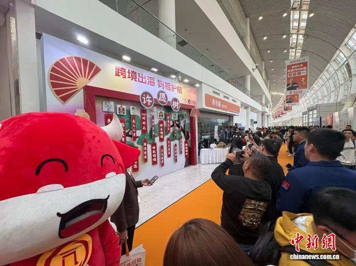 “跨境出海,妈祖护航。”步入展馆,妈祖元素的标语随处可见。妈祖文化主题专区陈列着妈祖华服、盲盒、微雕金身、祈福许愿树等展品,吸引海内外客商驻足洽谈、打卡拍照。