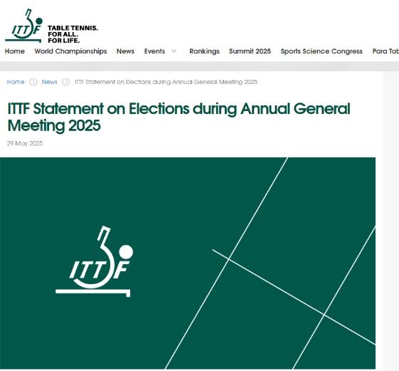 根据国际乒联章程,现任国际乒联理事会任期将于2025年11月24日届满,相关成员的选举和批准必须在此日期前完成。年度代表大会重新召开的日期和方式将适时公布。