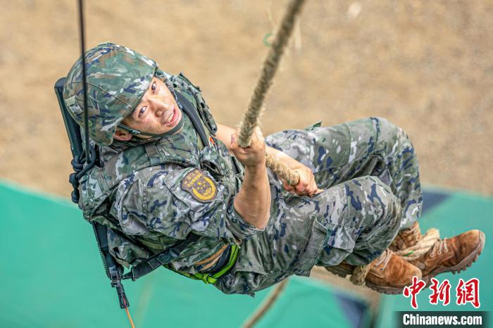 图为武警官兵正在进行抓绳上训练。刘明 摄