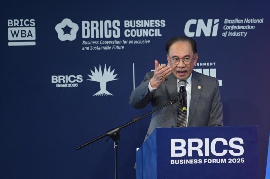 7月5日,马来西亚总理安瓦尔·易卜拉欣在巴西里约热内卢举行的金砖国家工商论坛开幕式上讲话。新华社发(卢西奥·塔沃拉摄)