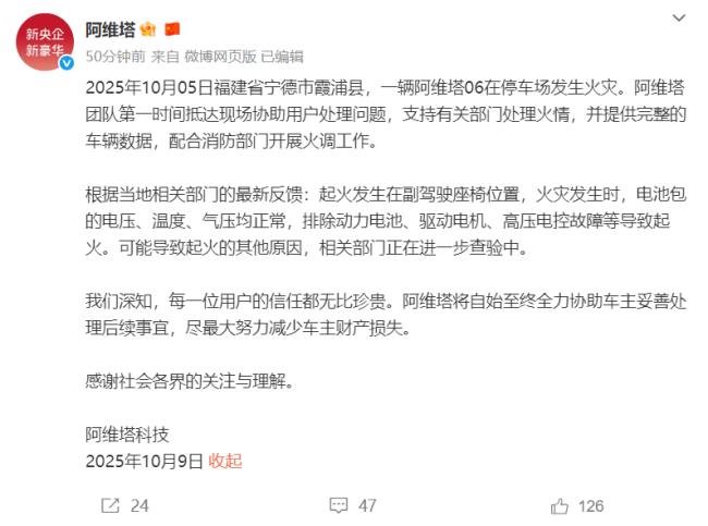 10月6日,阿维塔官方就此事表示,“具体原因还在核实当中。阿维塔06的所有车型,电池肯定都符合国家标准。阿维塔06的电池均采用宁德时代电池。”