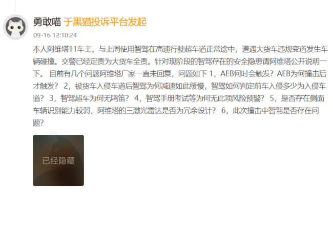 9月16日,一阿维塔11车主投诉称,使用智驾在高速行驶超车道正常途中,遭遇大货车违规变道发生车辆碰撞。其质疑,AEB何时会触发?AEB为何撞击后才触发?被货车入侵车道后智驾为何减速如此缓慢,智驾如何判定前车入侵多少为入侵车道?智驾超车为何无鸣笛?智驾手册考试等为何无此项风险预警……