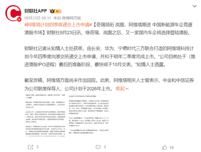 也因此,市场上一直有着关于阿维塔独立上市的传闻。9月,据“财联社”报道,有知情人士称,阿维塔最快或于10月交表,拟于明年二季度完成上市。此前,阿维塔相关人士曾透露,公司计划于2026年上市。
