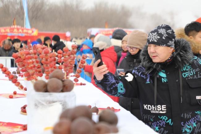 江边围满了市民和游客,人们的目光聚焦在江边。十多名采冰汉子裹着红棉袄,扎着腰带,手里紧握冰镩,稳稳站在冰面上。随着“咔咔”的镩冰声,他们默契配合,用铁钩娴熟地钩住冰块边缘,合力一拖,一块厚重敦实的冰块被缓缓拉出水面。江风裹着细碎的雪沫,江岸上鼓声震天。这块系着红绸的“头冰”,在冬日暖阳下泛着银光。