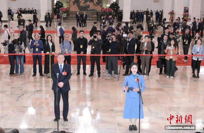 3月9日,十四届全国人大四次会议第二场“代表通道”集中采访活动在北京人民大会堂举行。图为活动现场。中新社记者 翟羽佳 摄
