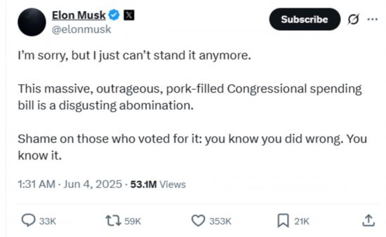 “对不起,我实在受不了了。这项规模庞大、荒唐可笑、夹带私货的国会支出法案简直令人作呕。”马斯克写道,“那些投票支持这项法案的人真该感到可耻:你们知道自己做错了。你们自己心里清楚。”