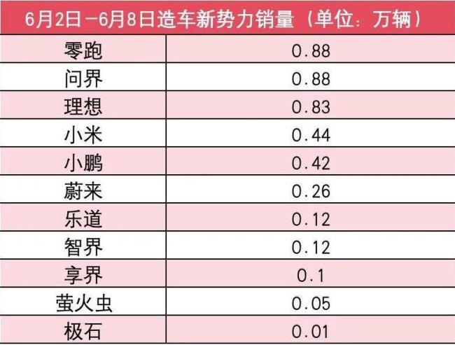 新势力6月第1周销量榜:淡!理想第三,小米跌40%,竟无一家过万