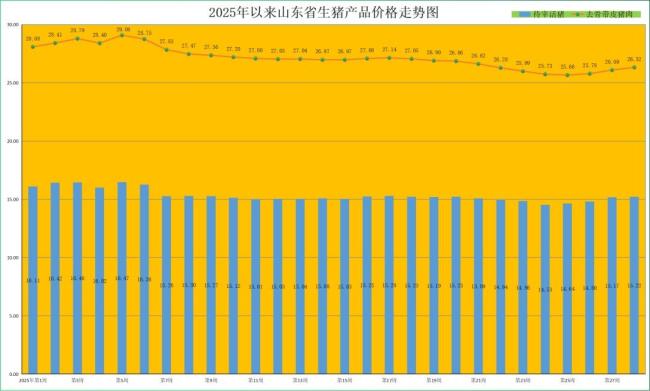 猪肉方面,根据全省26个畜禽生产定点监测县的数据,第28周全省肥猪出栏均价为15.22元/公斤,同比降低20.31%,环比增长0.33%。猪肉价格小幅回暖,本周猪肉均价为26.32元/公斤,同比降低17.62%,环比回升0.88%。