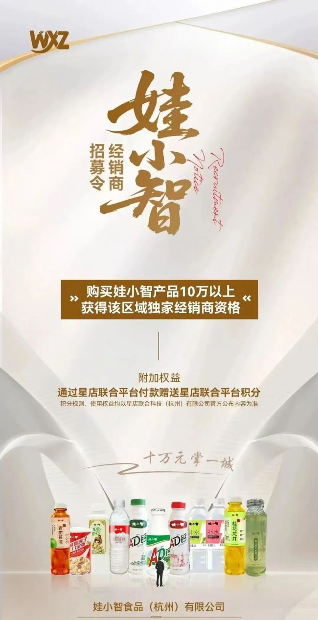 官方海报显示,娃小智产品体系包括AD钙奶、椰子水、矿泉水、茶饮料、天然水、八宝粥几大品类。