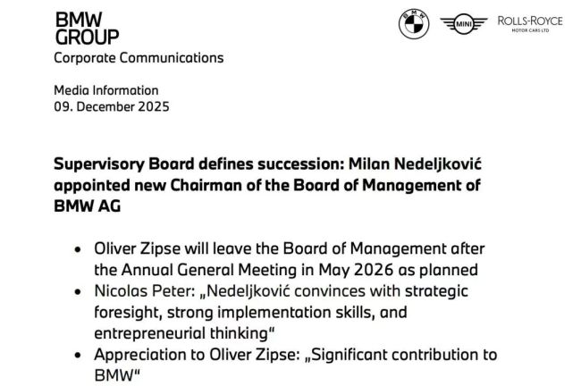该举措已获得监事会批准,内德尔科维奇将在宝马年度股东大会后立即接任,该股东大会计划于2026年5月14日举行。宝马历史上的CEO基本都从内部选择,并且在工作资历上都要求在生产制造研发端等领域有相应的工作经验。内德尔科维奇于1993年加入宝马公司,在2019年加入管理委员会之前,曾在该公司的牛津、莱比锡、慕尼黑和企业质量部门担任管理职务。