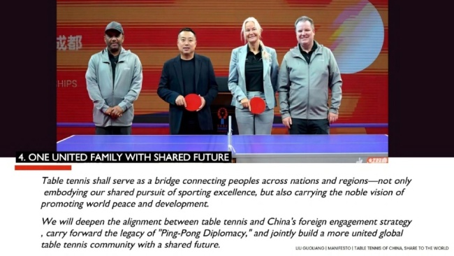 刘国梁坚信,只有当全球乒乓球整体水平提升,才能在更多国家和地区扩大乒乓球影响力,吸引更多青少年参与,使赛事获得更多关注和赞助,从而提升乒乓球项目及其球员的形象价值,实现可持续发展。他希望以中国力量推动世界乒乓球进步,建立世界乒乓球命运共同体,惠及各方,发挥乒乓球促进世界和平和团结的独特作用。