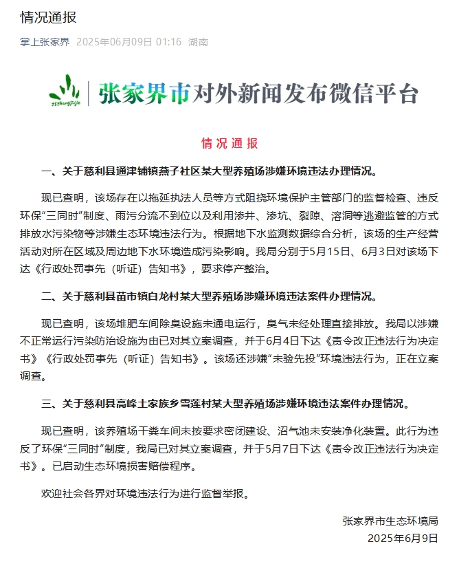 中新网6月9日电 据“掌上张家界”微信公众号消息,6月9日,张家界市生态环境局通报关于3家大型养殖场涉嫌环境违法案件的办理情况。具体通报如下: