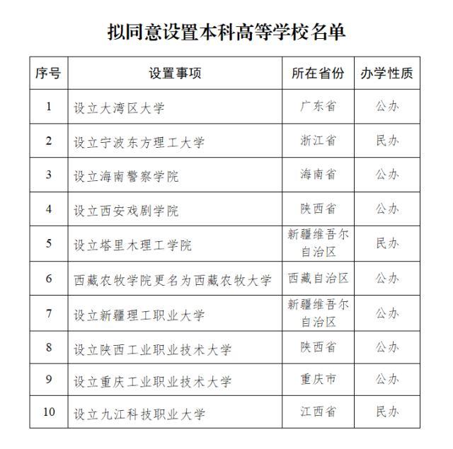 教育部发展规划司于6月11日发布了《关于拟同意设置本科高等学校的公示》,其中包含了大湾区大学和海南警察学院等十所学校。根据《中华人民共和国高等教育法》《普通高等学校设置暂行条例》等相关规定,结合第八届全国高等学校设置评议委员会的考察评议结果,并经教育部党组会议审议,决定对这些学校进行公示。公示时间为2025年6月11日至6月17日。在此期间,如对拟设学校有不同意见,可以署名方式反映。
