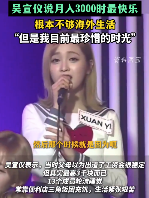 吴宣仪在采访中表示,月入3000元时因团队成员多13人、生活忙碌:如轮流睡觉、吃三角饭团等,而感到充实快乐,但承认收入不足以支撑海外生活。