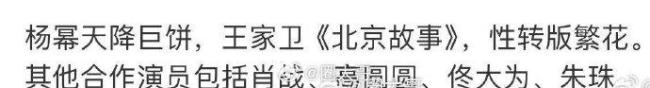 2025对杨幂也太好了吧!在唐嫣之后,85花杨幂也要和王家卫导演合作了,而且马上就要官宣了,据说《北京故事》是性转版的《繁花》,肖战、高圆圆、朱珠也会参演,已经开始期待杨幂和肖战的对手戏了!