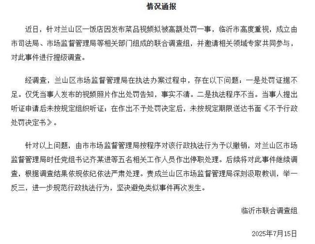 山东临沂兰山区餐馆老板黄女士因在网上分享了一道“蛤蟆汤”的视频,收到了45万元的高额罚单,此事引发了广泛关注。7月15日,临沂市联合调查组发布通报称,对此事高度重视并成立调查组进行提级调查。经调查发现,兰山区市场监督管理局在执法过程中存在处罚证据不足、执法程序不当等问题,决定撤销该行政执法行为,并对相关工作人员作出停职处理。后续将继续调查,依规依纪依法严肃处理。