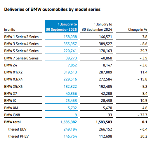从销量来看,今年前九个月,宝马、MINI和劳斯莱斯品牌全球交付量接近180万辆(1795734辆),同比增长2.4%。2025年第三季度交付量达588140辆,同比稳健增长8.7%。前九个月,欧洲(+8.6%)和美洲(+9.8%)地区的增长势头尤为强劲,而中国市场是唯一下滑的市场。