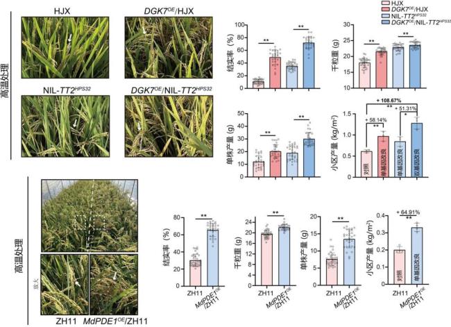 研究团队经过多年努力,鉴定到水稻中两个关键调控因子:DGK7(二酰甘油激酶)和MdPDE1(磷酸二酯酶)。这两个因子像一套精密协作的“警报系统”,将高温物理信号一步步转化为细胞能够理解的“生物指令”,完成从细胞边界到细胞核的“传讯”。这一发现系统连接了从细胞膜脂质重塑到核内信号级联的完整过程,解决了领域内长期存在的难题。