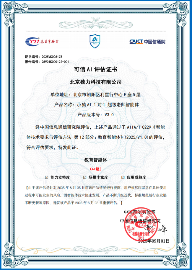 其搭载的小猿AI「超拟人」老师,基于多模态感知技术,提供“能听、能看、能讲解”的1V1互动体验。在数百名一线教师的测评中,其类真人表现评分超过90分。在中国信通院的教育智能体评测中,该智能体亦获得最高等级4+级认证,成为行业首批达成该级别能力的教育智能体。
