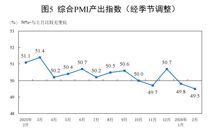 2月份,综合PMI产出指数为49.5%,比上月下降0.3个百分点,表明我国企业生产经营活动总体较上月有所放缓。