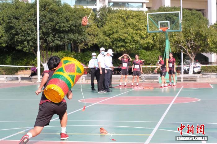 图为“投绣球”运动项目。运动员们不仅需借助技巧将绣球投入约10米高的铁环内,还需通过默契协作,将绣球投入数米外队友身上的背篓中。(资料图) 刘俊聪 摄