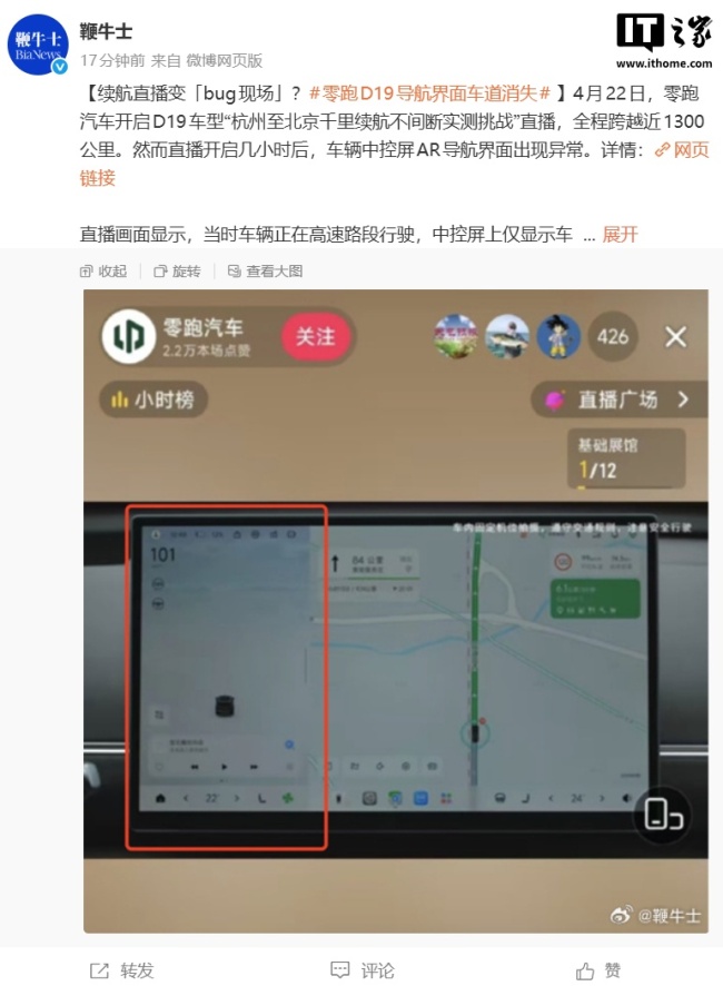 零跑汽车于4月22日早晨开始了一场名为“杭州至北京千里续航不间断实测挑战”的直播,全程计划跨越近1300公里。然而,在直播进行几小时后遇到了问题,车辆中控屏上的AR导航界面出现异常,仅显示了车辆模型而车道线和其他车辆等重要信息全部消失。